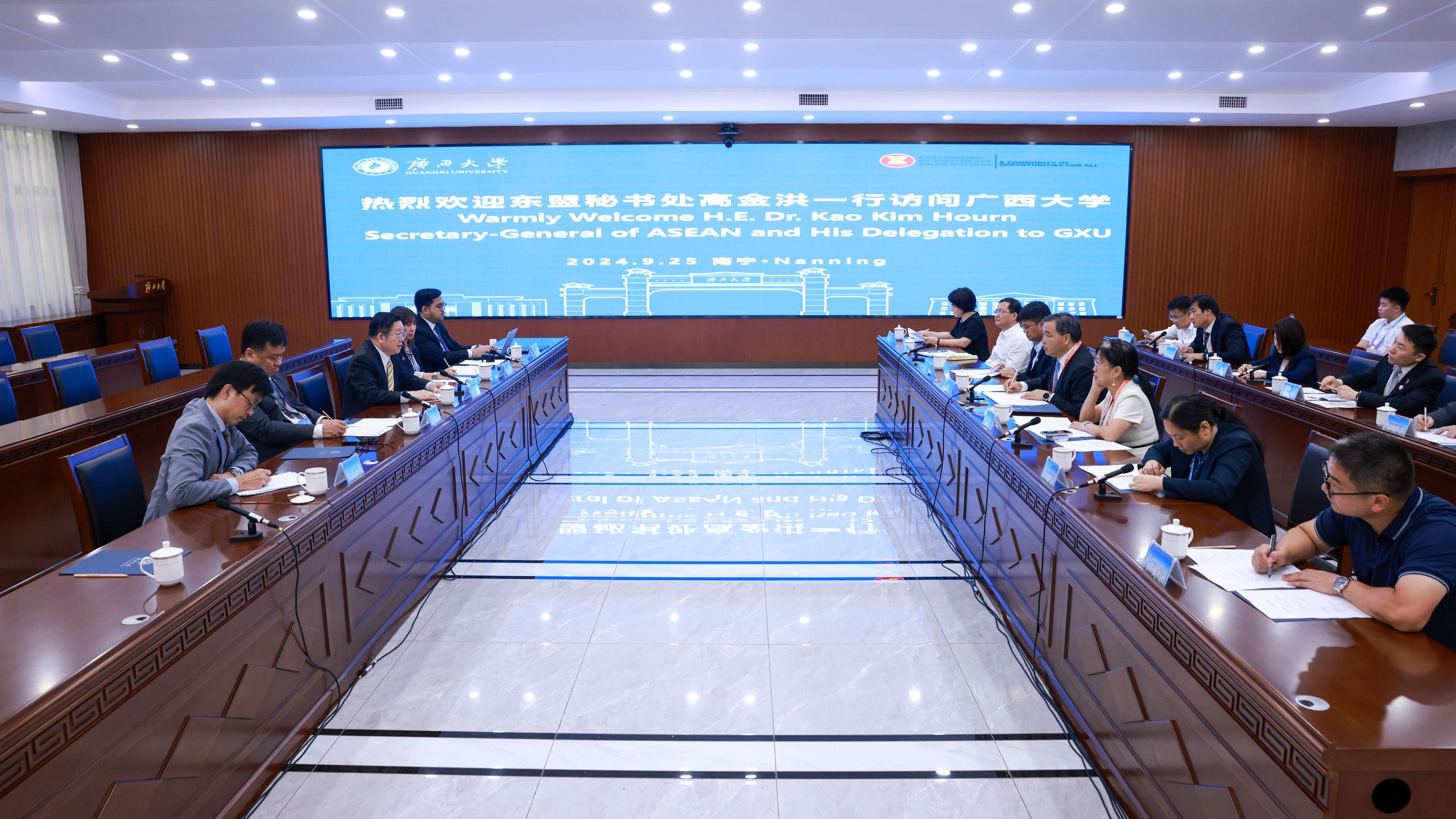 9月25日,东南亚国家联盟秘书长高金洪(Secretary-General of ASEAN, H.E. Dr.Kao Kim Horn)携代表团访问pg电子中国官方网站,并与师生代表交流、座谈。我校校长韩林海、副校长肖建庄会见来宾。
